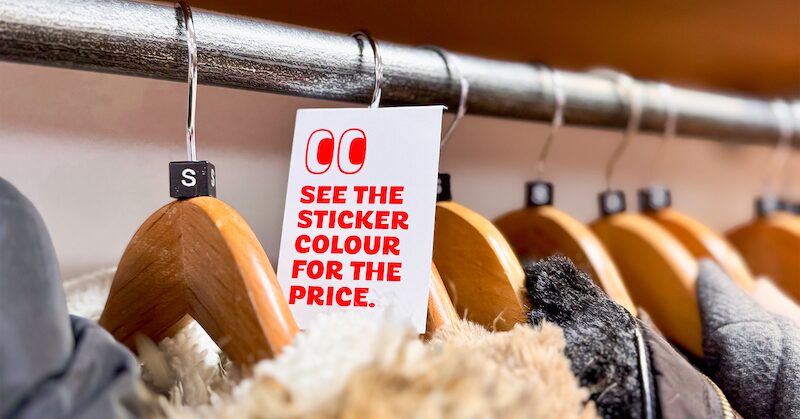 The message in the window: ‘2 drops a week. 3 fixed prices. Ready, set, hunt.’ serves as an open, unapologetic invitation to discover your own Crisis Dropshop finds. The stickers accompanying the message in the shopfront window introduces the pricing sticker concept to potential shoppers as they’re walking down the street.