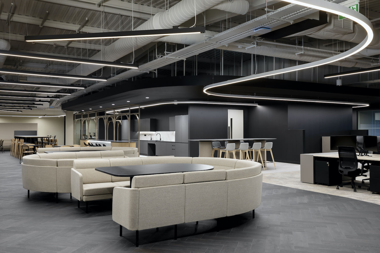 A unifying design concept runs throughout the HQ, centred on a continuous visual “thread” formed through linear lighting and metal detailing. Beginning at the guest entrance, this feature guides movement through the space, framing breakout areas, teapoints, and product displays, and creating a sense of connection across the floor. The guest arrival experience is intentionally warm and welcoming, using natural stone and grey tones to establish a calm, confident first impression.