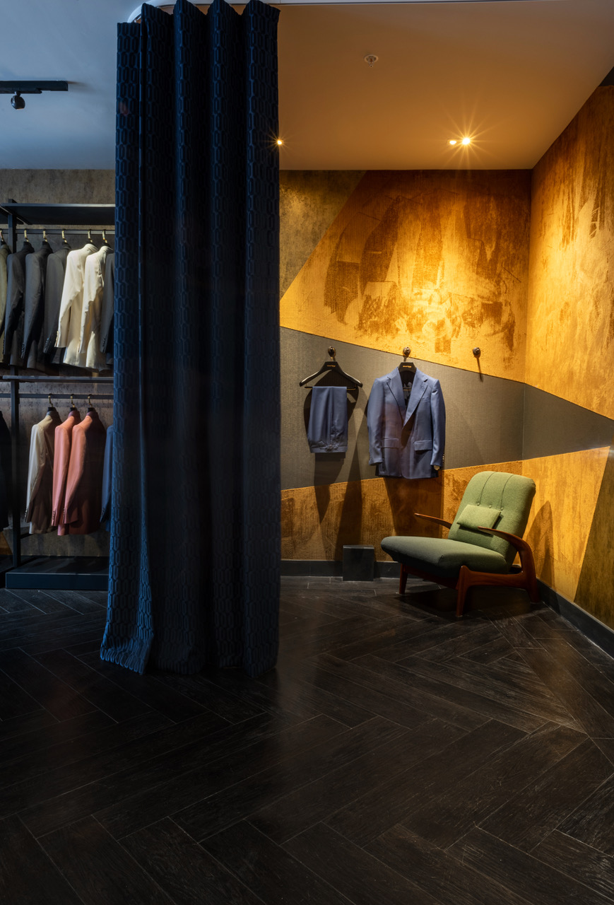Daniel Hopwood founder of Studio Hopwood says:“The creativity of Dominic and Edward were both very exciting to me. It”s been a genuinely collaborative process from start to finish. I”m proud of the flow of the store the way it will welcome people and how special it feels when you first walk in. There are many things I love about Edward Sexton but I”m particularly attracted to the Art Deco feel that resonates throughout the house. In the ’70s, Edward took the Deco feel of the ’20s and ’30s and made it current and more louche. And that”s the feeling I wanted to achieve in the store taking that concept and doing it again but for now. There”s nothing retro about it. Highlights including our collage of wall coverings, created by a specialist craftsperson. Corduroy is melded with vinyl and rich velvets, while the dramatic lighting and rich textures evoke the luxurious nature of the clothes, as well as the indulgent experience of shopping on Savile Row.”