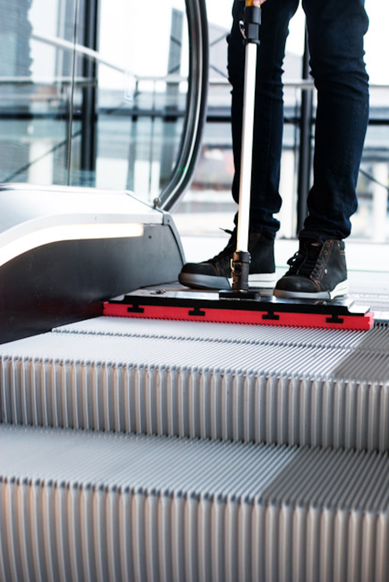 Tools such as EscaTEQ’s Tread-TEQ system can clean an escalator in as fast as five minutes, with just one operator, using a tool that requires less physical effort than a broom and less physical skill than a mop. “The toothbrush for your escalators™” has arrived, allowing facilities to clean their escalators 12 times per year for about the same annual cost as just one annual restorative cleaning.