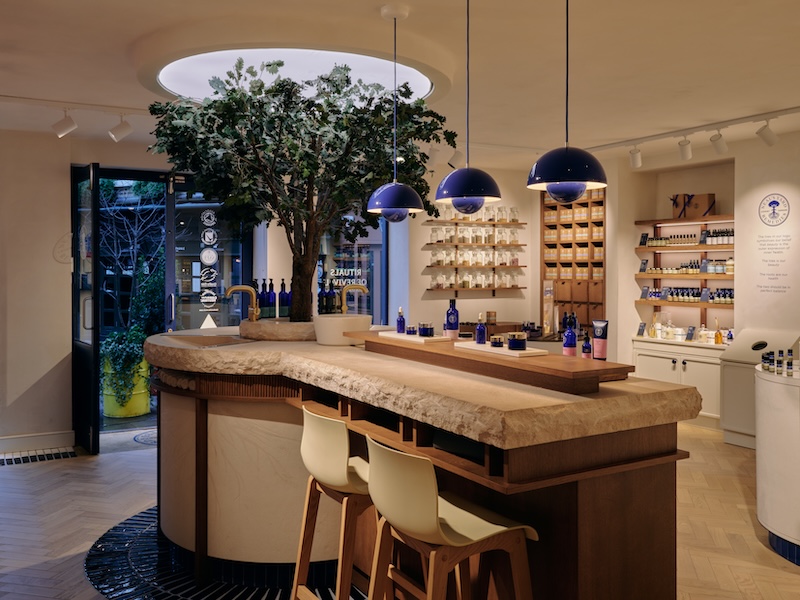 These are contrasted by Neal’s Yard Remedies’ signature deep cobalt blue, expressed through ceramic tiles, accent lighting, metalwork and product displays.