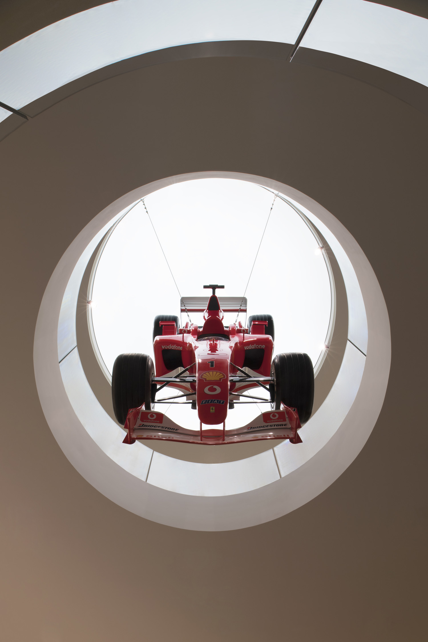 Entering the store, the eye is immediately drawn to the central core ribbon-like staircase inviting the customer to explore the three floors. The interior walls of the store consist of hand applied terracotta elegantly contrasted by bespoke white clay bricked walls. A dramatic spectacle in the atrium is the suspension of a full-size Formula 1 car, an exact model of the same single-seater in which Michael Schumacher won the World Championship in 2002, which can be seen from all floors and all angles.