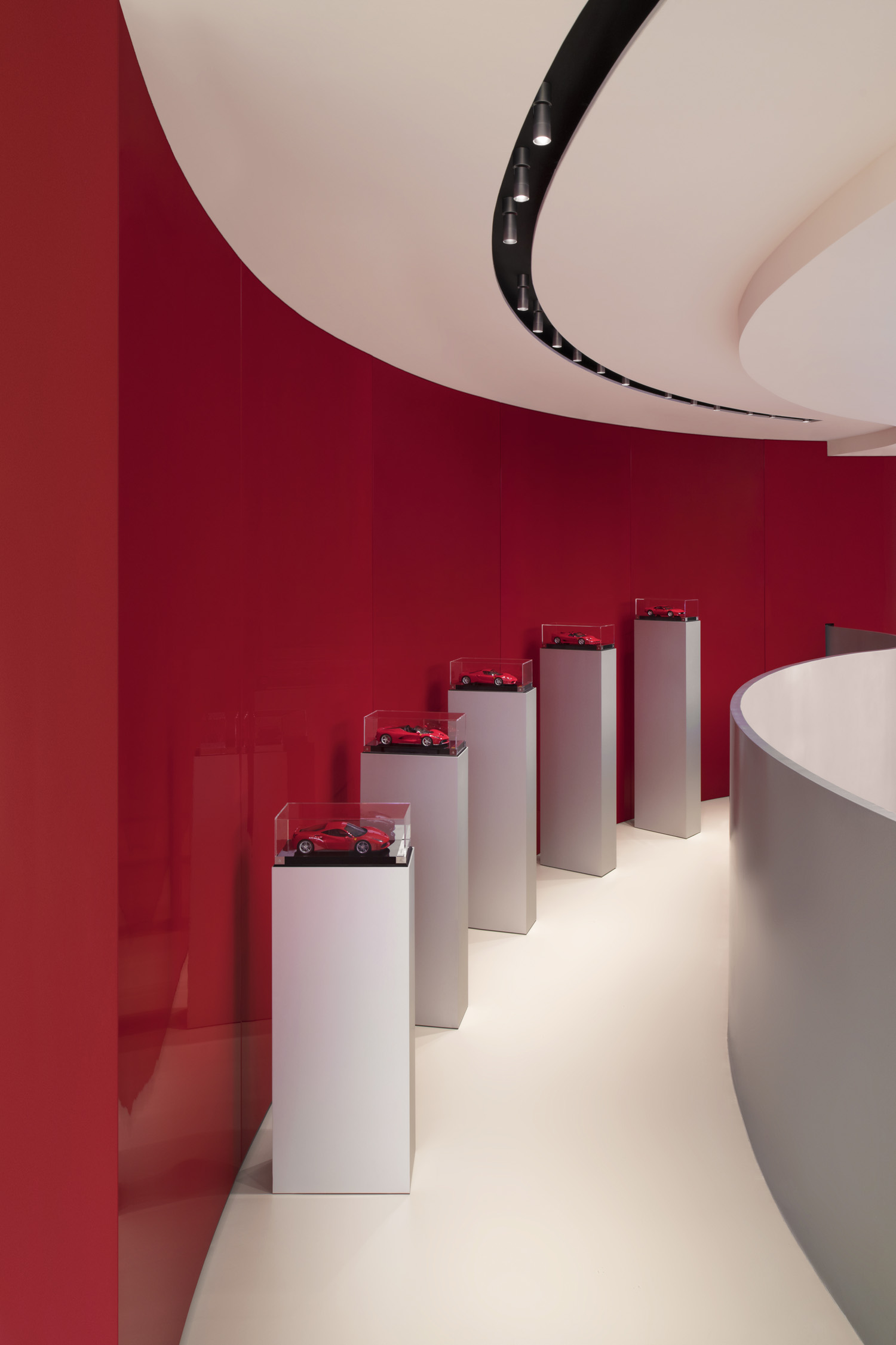 The story starts outside the store where the building’s arched windows are punctuated by red glass embodying Ferrari’s symbolic colour with a degrade that fades into transparency to symbolise the performance and speed of the cars.