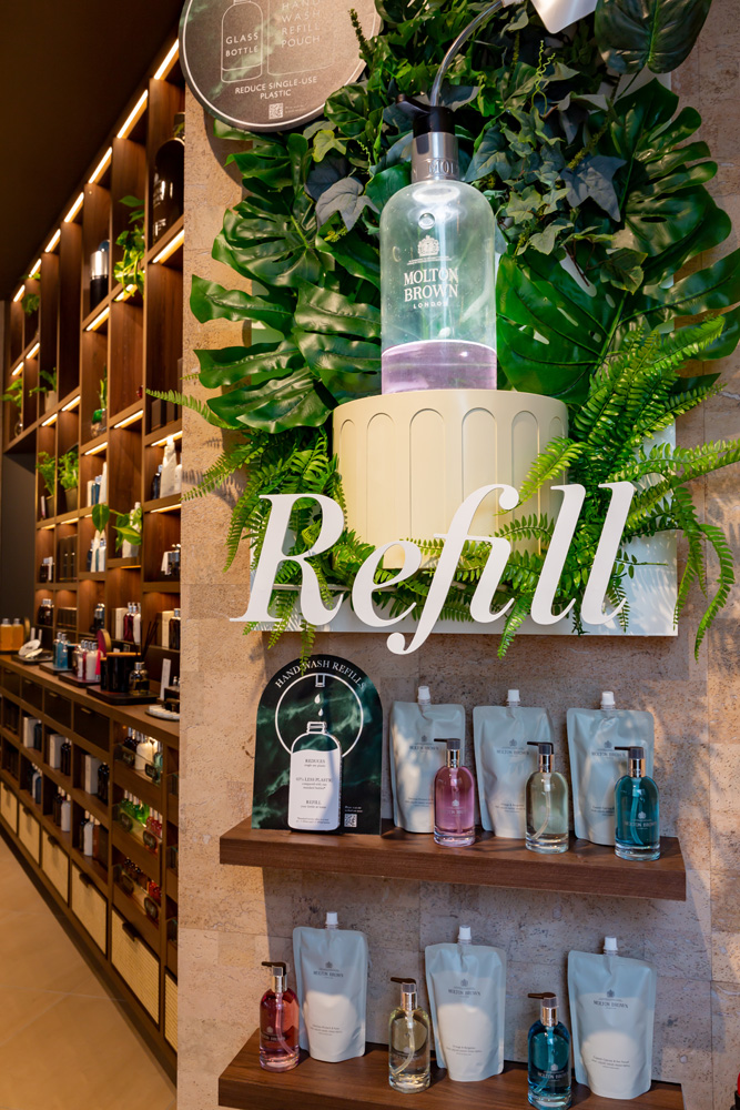 Sustainable solutions are at the heart of the redesign, flourishing plants help purify the air, including a herb garden, grown using a method called ‘hydroponics’. This involves creating a controlled, pesticide-free environment with LED technology – the same way we’re growing the herbs in our Botanical Hair Care collection. The ‘Return. Recycle. Reward.’ scheme means you can bring back your Molton Brown plastic bottles to recycle while customers enjoy 10% off your next purchase as a reward.