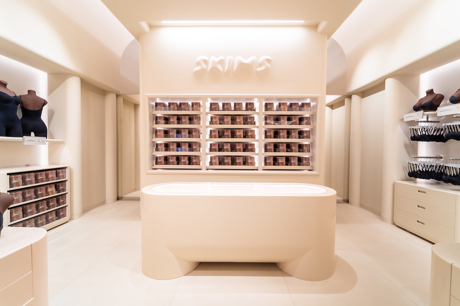 Designed to immerse customers in the full SKIMS experience, the space reflects the brand’s global retail language: a bold, minimalistic aesthetic strikes a harmonious balance between strength and softness. Monolithic forms, curved openings, and reflective surfaces are bathed in warm lighting and anchored by oversized 3D SKIMS signage. The end result is a store as iconic as the product assortment it holds, delivering a distinctly elevated retail experience.