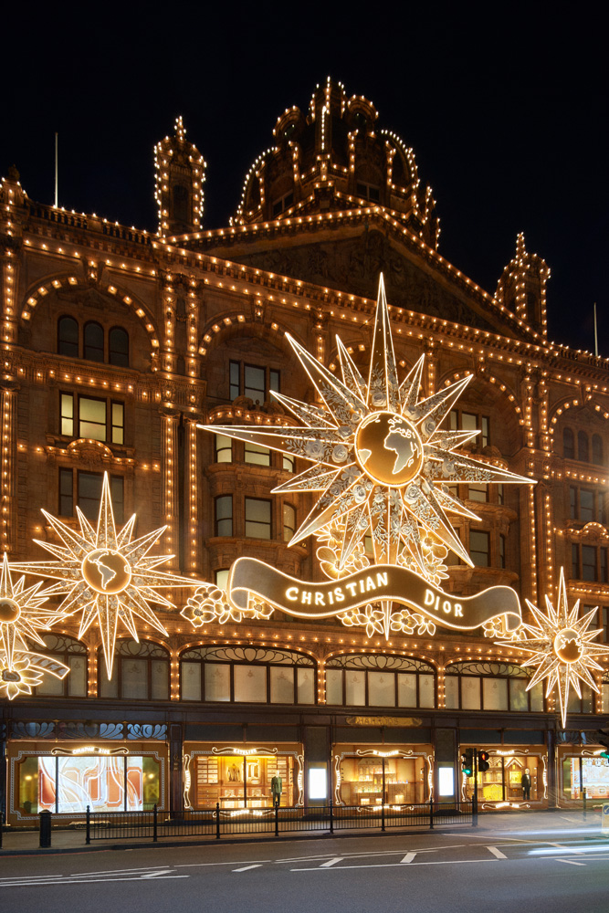 For this breathtaking event, Harrods is decked out in a dazzling installation deployed along its historic façade on Brompton Road. A reinterpretation of sketches created during a compelling dialogue between Maria Grazia Chiuri and Roman artist Pietro Ruffo for the Dior cruise 2023 collection, this monumental work highlights the compass rose – a precious symbol dear to the founding couturier – magnified with poetic motifs, expressions of classic Dior references. In a celestial choreography, the lucky star flourishes endlessly, sublimely scintillating to infinity on the facade’s ornate Edwardian architecture.