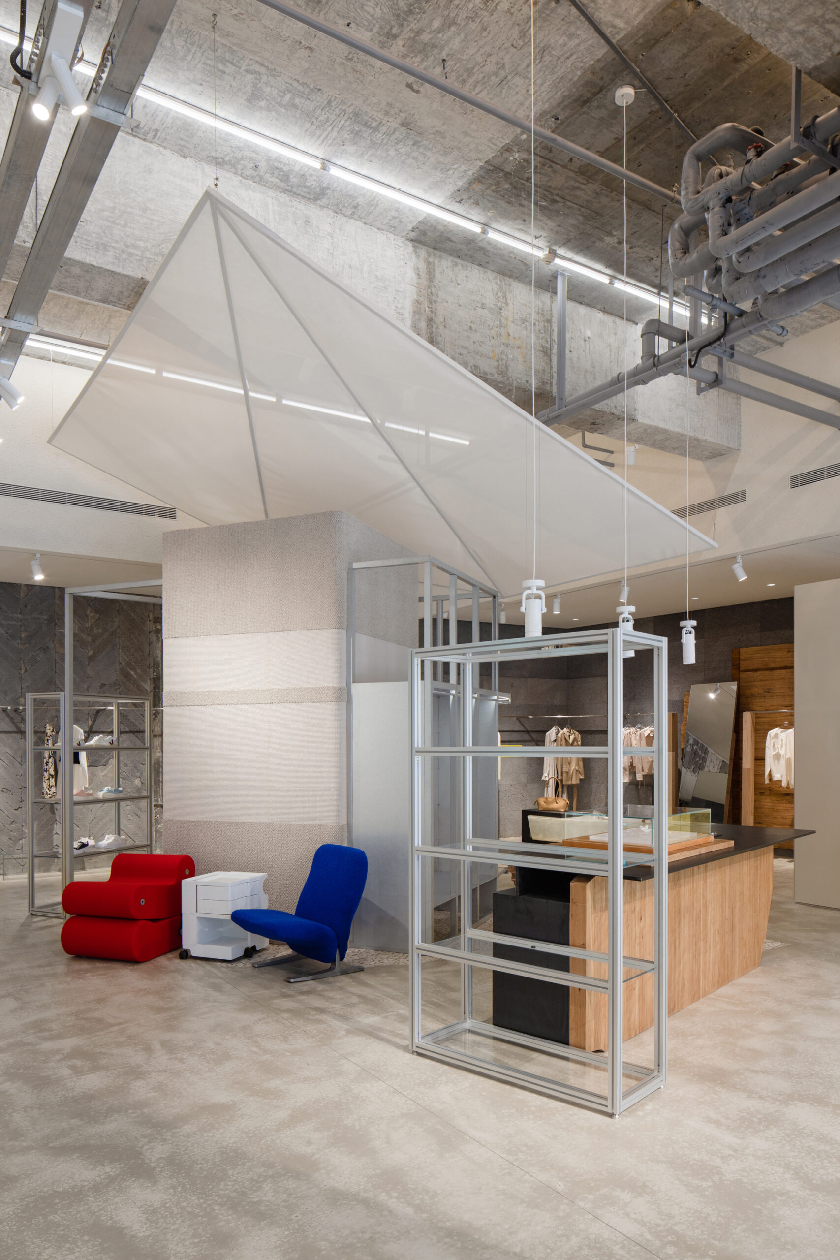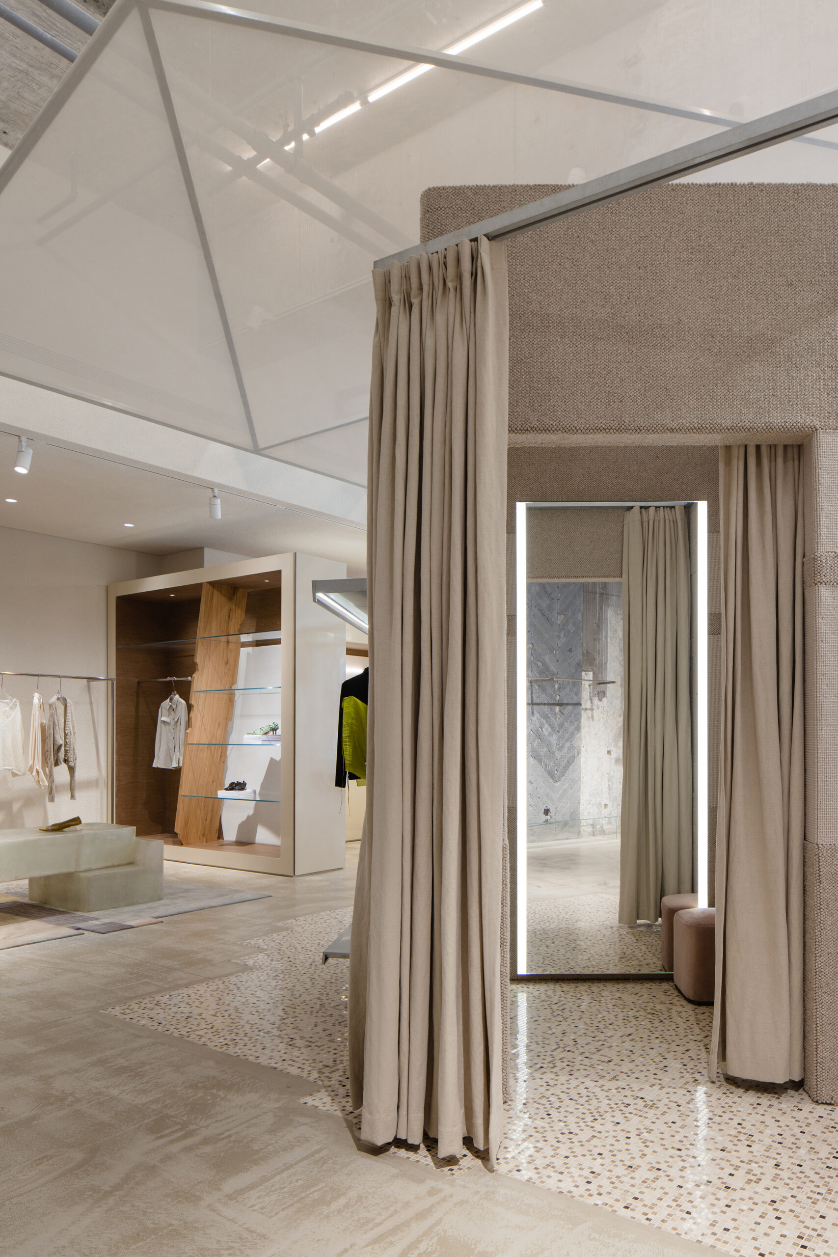 As the biggest structure in the store, the fitting room is located in the centre of the display area. The fabric hanging upon the fitting room helps to visually separate the space and soften the light.