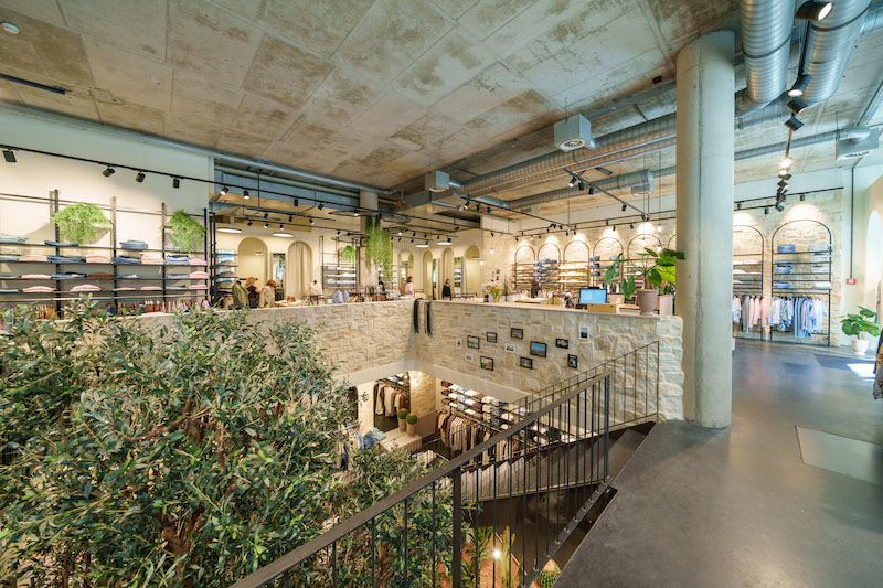 The basement men’s area is connected to the ground floor via a large opening in the centre of the room. This architectural feature creates an exciting visual axis between the levels and provides a striking setting for product presentations. An impressive artificial olive tree extending over both floors is at the centre of the store, giving the space a special atmosphere. A suspended bamboo mat ceiling creates a play of light and shadow, adding warmth and structure to the space.